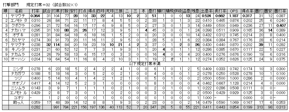 | 首位打者 | ヤマウチ | .364 | 3年連続4回目 |