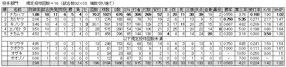 | 最多奪三振 | ナカハマ | 38個 | 2年連続13回目 |
