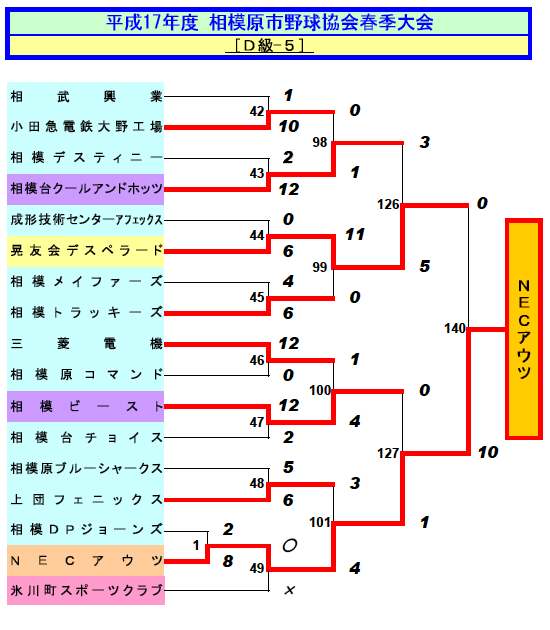 トラッキーズはD級-5に入り試合番号45番、2回戦で昨年の春D-2で優勝している相模メイファーズと対戦することになった。 この日発表された日程では13日がD級20試合、20日がC級10試合D級10試合、27日がB級5試合C級5試合D級10試合が行われることになり、 順調に進めば4月3日が大会になると予想される。 今回注意事項として挙げられたのは、キャッチャーのプロテクター使用が義務付けられたことと、 投球動作において野球規則8.01を厳格にとるということ。 これは具体的には投球動作に入ってからの静止や二段モーションはボークを取るというものである。 また新公認球については来年度の大会より使用されるということもあわせて発表された。 春季大会D級-5トーナメント表 |