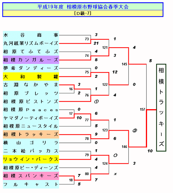 オザキ監督は就任1年目、最初の大会で優勝監督となった。 オガタ投手のノーヒットノーランから始まった今回の大会は、決勝までの4試合すべてでT軍が先取点を取り、 準決勝、決勝では一旦同点にされたが準決勝は抽選で辛勝、決勝は同点からさらに突き放す内容で優勝を決めた。 先制して勢いに乗り終盤の相手の攻撃に耐えてゲームセットまでもたせる、という試合運びは4年前の優勝時とまったく同じ。 とにかく勢い頼みのチームカラーは未だ健在といったところか。 ○オザキ監督のコメント チーム関係者の気持ちと勢いが良いバランスで備わった結果だと思います。 これも皆様のおかげだとつくづく思います。 よく、勢いでの勝利は実力ではないと言う人もいますが‥勢いをこちらに掴むことこそがまさにチームの実力だと思っております。 今後もどの試合でも関係なく、全員で明るく、一生懸命に草野球を楽しめたらこれ幸いであります。 (たまには真面目にコメントしてみました。) 春季大会D級-7 トーナメント表 |