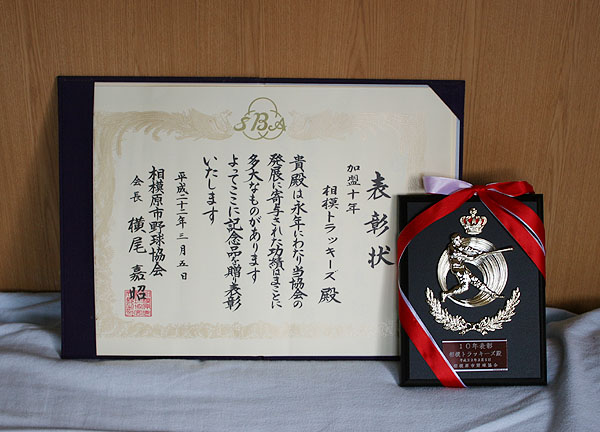 | 2010年 加盟10年表彰状、記念盾 | 2011年秋季大会 D級-5 優勝盾 |