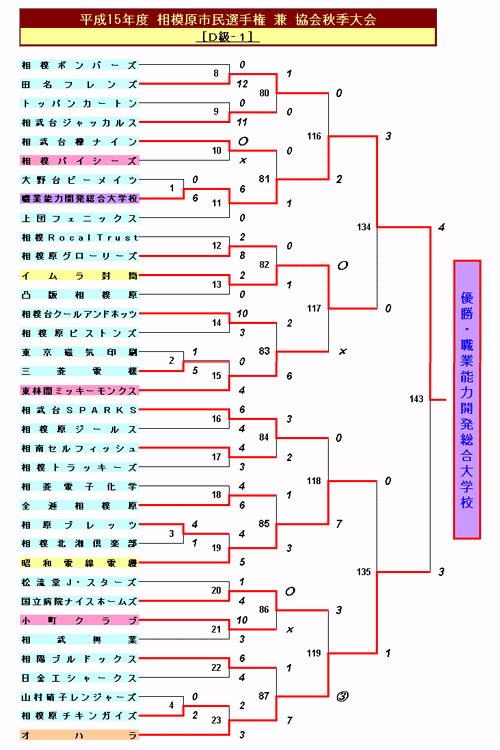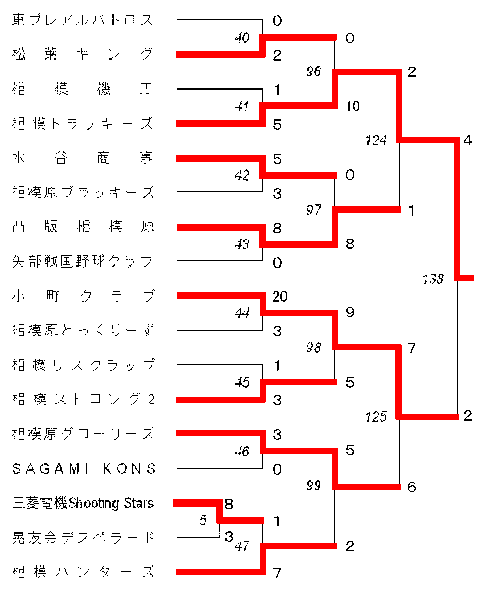 | ◆2003年春季大会 (D-5 トーナメント表) | 2回戦 | ○トラッキーズ 5-1 相模機工 〔旭中〕 | 3回戦 | ○トラッキーズ 10-0 松葉キング 〔鹿沼公園野球場〕 | 準決勝 | ○トラッキーズ 2-1 凸版相模原 〔三栗山〕 | 決勝 | ○トラッキーズ 4-2 小町クラブ 〔日金工〕 |